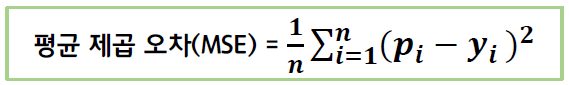 평균 제곱 오차(Mean Squared Error, MSE): 오차 합의 평균