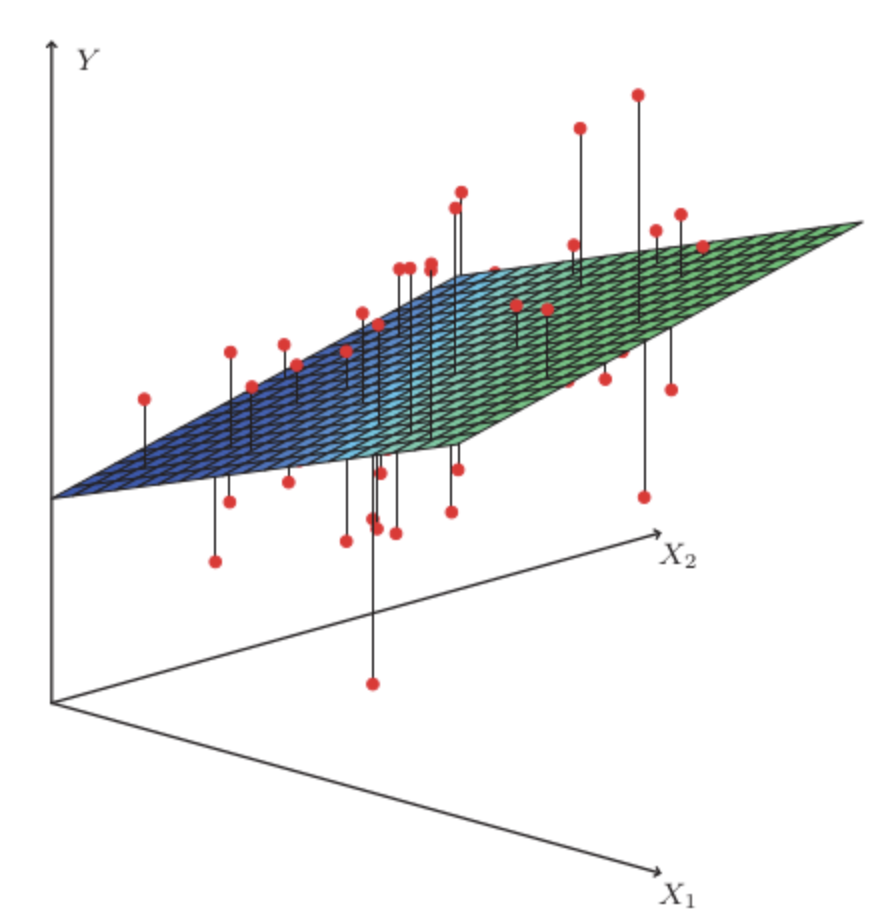 여러 독립 변수에 의해 영향을 받는 경우로 2개의 독립 변수면 그래프는 평면으로 나타난다.