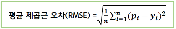 - Root Mean Square Error(평균 제곱근 오차) 방정식을 가장 많이 사용