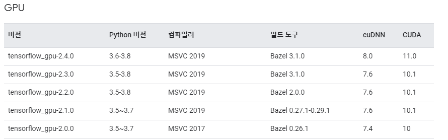 호환되는 CUDA와 cuDNN 버전은 아래 링크에서 확인할 수 있다.