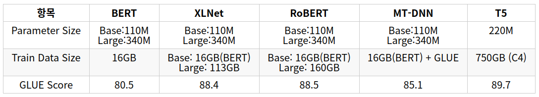 - 번역, 요약, 질의응답 등의 모든 task들은 자연어 문장이 들어가고 자연어 문장이 나온다는 점에 착안하여 모든 NLP task를 'Text-to-Text' task로 정의