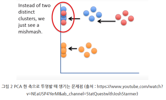 - 생성된 두 축의 해석이 어렵고 선형 방식으로 정사영하기 때문에 차원이 줄어들면서 군집된 데이터들이 뭉개질 수 있음