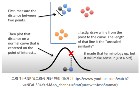 - t분포를 이용하여 하나의 기준점을 정하고 모든 다른 데이터와 거리를 구한 후 그 값에 해당하는 t분포 값을 선택하여 값이 유사한 데이터끼리 묶어주는 방법