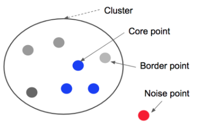 - MinPts: 클러스터를 형성하기 위해 필요한 최소 이웃 수. 한 군집은 minPts 보다 많거나 같은 수의 데이터로 구성됨. 만약 minPts보다 적은 수의 데이터가 eps-neighbors를 형성하면 노이즈(noise)로 취급함