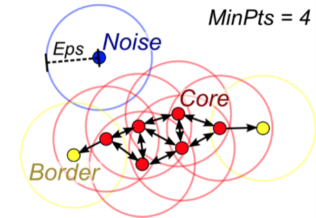 - Eps-neighbors: 한 데이터를 중심으로 epsilone 거리 이내의 데이터들을 한 군집으로 구성