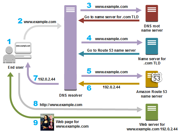- Amazon Route 53 이름 서버는 example.com 호스팅 영역에서 www.example.com 레코드를 찾아 웹 서버의 IP 주소 192.0.2.44 등 연관된 값을 받고 이 IP 주소를 DNS 해석기로 반환합니다.