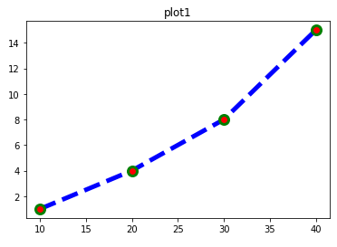 plt.plot([10, 20, 30, 40], [1,4,8,15], c='b', lw='5', ls='--', marker='o', ms=10, mec='g', mew=3, mfc='r')