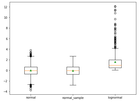 ax1.boxplot(box_plot_data, labels=['normal', 'normal_sample', 'lognormal'], showmeans=True)