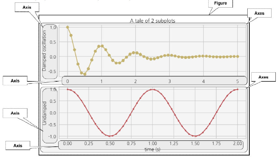 Matplotlib가 그리는 그림은 Figure 객체, Axes 객체, Axis 객체 등으로 구성된다.