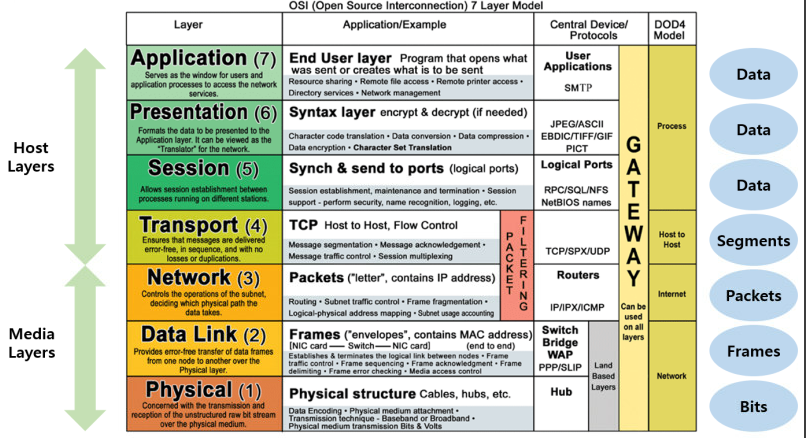 | 4계층, Transport | 전송 계층 프로토콜: TCP, UDP, ARP 장비: 게이트웨이 |