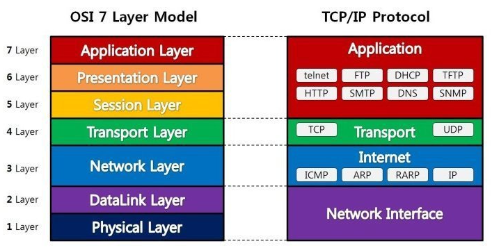 | 7계층, Application | 응용 계층 프로토콜: DHCP, DNS, FTP, HTTP, Telnet, SMTP |