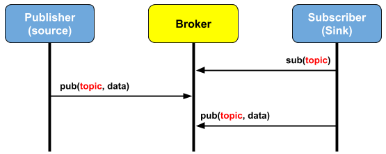 - 애플리케이션들은 Message Bus에 연결하고 관심있는 토픽(Topic)을 등록 해서 메시지를 구독(SUB)하거나 발행(PUB)한다.