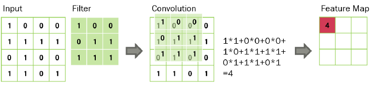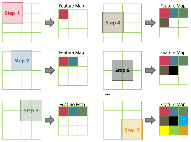 - 입력 데이터를 지정된 간격으로 순회하며 채널별로 합성곱을 하고 모든 채널(컬러의 경우 3개)의 합성곱의 합을 Feature Map으로 만듦