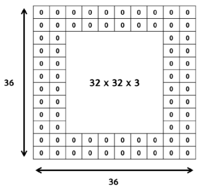 - 패딩은 입력 데이터의 외각에 지정된 픽셀만큼 특정 값으로 채워 넣는 것을 의미