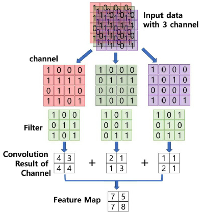 - 입력 데이터가 여러 채널을 갖을 경우 필터는 각 채널을 순회하며 합성곱을 계산한 후, 채널 별 feature map을 만듦