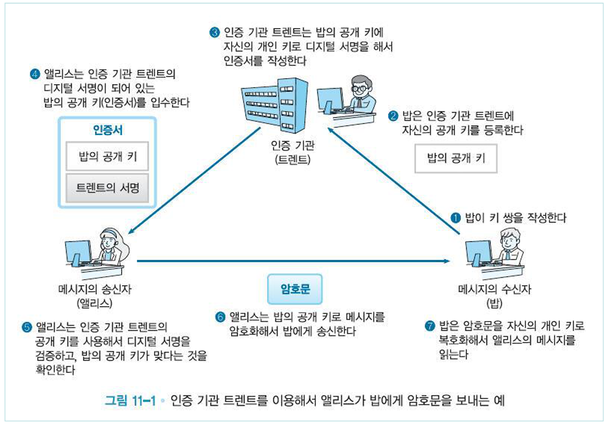- 인증 기관을 통해 공개키가 정당한 소유자의 공개키라는 인증 가능