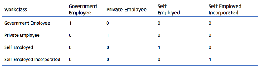 - 범주형 변수를 0 또는 1 값을 가진 하나 이상의 새로운 특성으로 표현