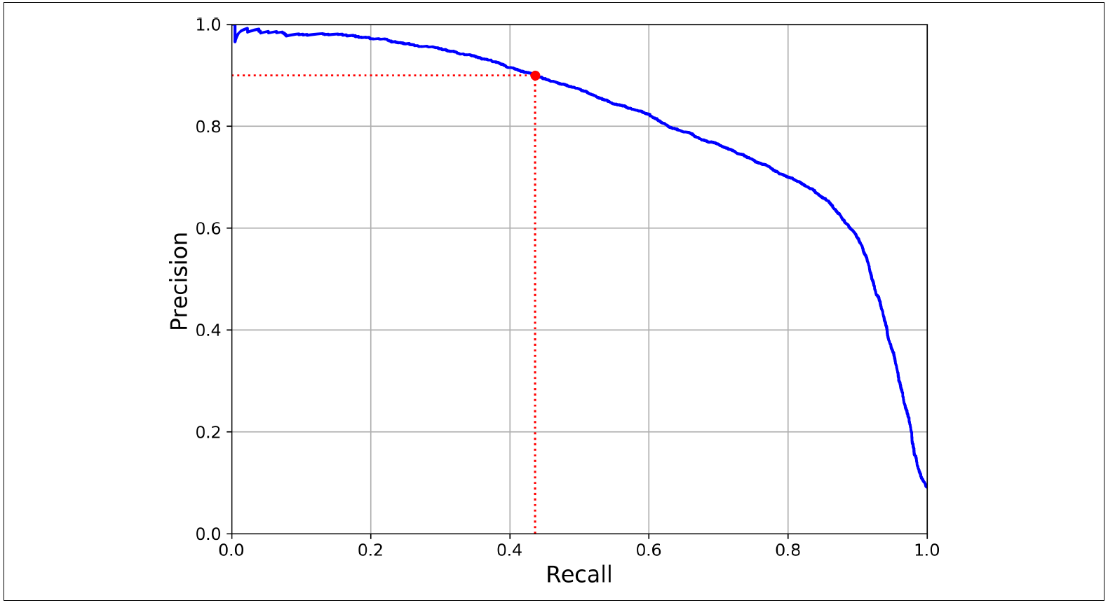 0부터 1 사이의 모든 임계값에 따라 x축을 재현율(Recall), y축을 정밀도(Precision)로 그린 그림