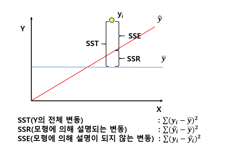 - SST(Sum of Squares Total, 관측치와 평균 차이)