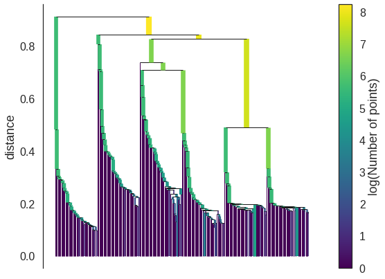 - min_cluster_size 파라미터를 활용하여 hierarchy의 각 노드를 더 합쳐가며 smaller tree를 만듦