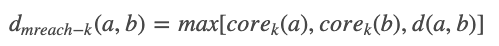 - mutual reachability distance of point a and b: 두 점 a와 b의 거리를 잴 때 {1. a의 이웃과의 거리, 2. b의 이웃과의 거리, 3. a와b 자체의 거리} 중 max값을 고르는 것.