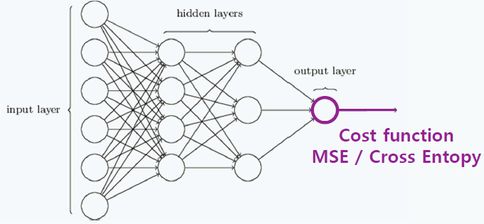 - Feed Forward: Input -> Output(최종 출력단에서 에러와 cost function을 구함)