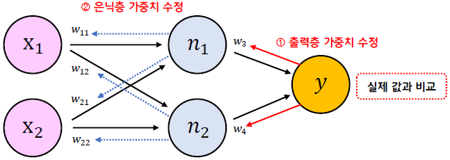 - 최적의 학습 결과를 찾기 위해 역방향으로 에러를 전파(backward propagation of error)