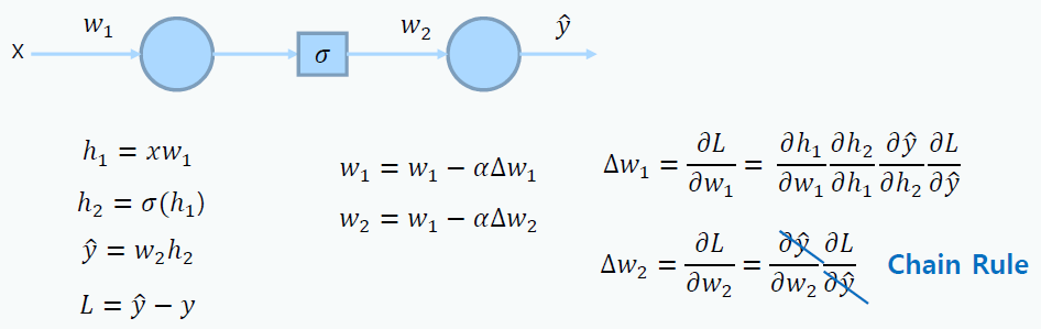 - 경사하강법을 이용해 바로 앞 가중치를 오차가 작아지는 방향으로 업데이트