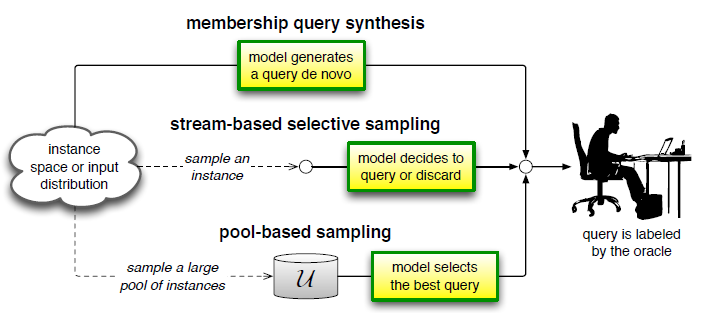 학습 모델(learner)가 데이터 인스턴스에 대한 라벨을 쿼리도록 하기 위해 다음과 같은 세 가지 셋팅을 자주 사용한다.