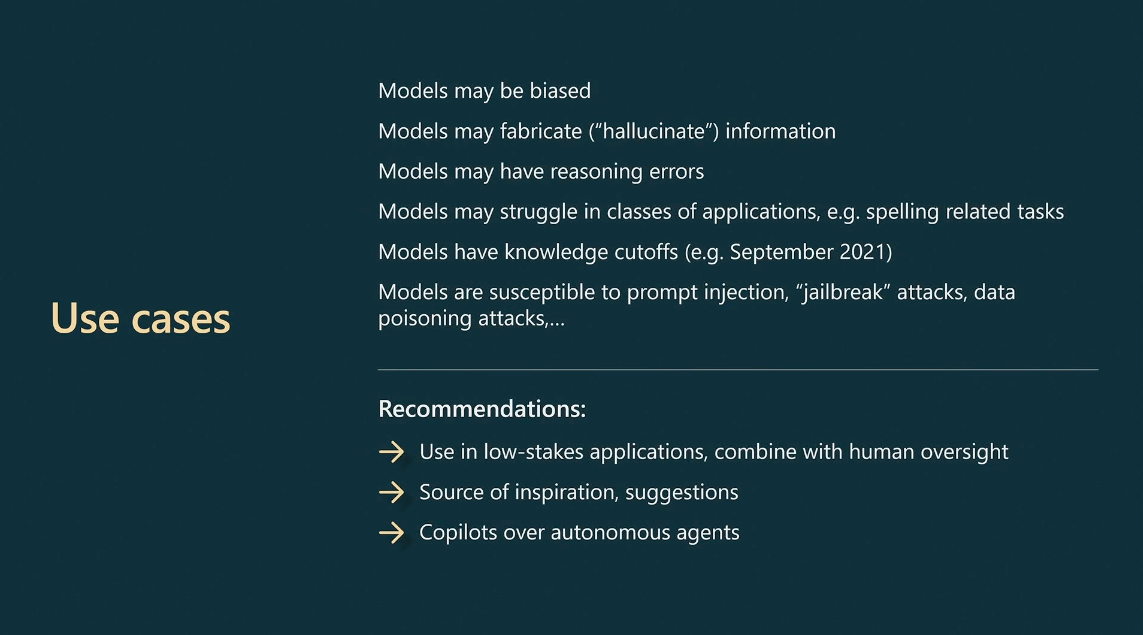 모델이 편향될 수 있습니다. 그들은 정보를 조작하고 환각(hallucinate) 시킬 수 있습니다. 추론 오류(resoning errors)가 있을 수 있습니다. 그들은 전체 종류의 응용 프로그램에 어려움을 겪을 수 있습니다. 그들은 지식 컷오프가 있기 때문에 예를 들어 2021년 9월에 대한 정보를 모를 수 있습니다.