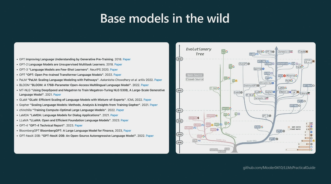 이제 그 이후로 모든 사람이 훈련한 기본 모델의 전체 진화 트리를 보았습니다. 모든 모델을 사용할 수 있는 것은 아닙니다. 예를 들어 GPT-4 기본 모델은 출시되지 않았습니다. API를 통해 상호 작용할 수 있는 GPT-4 모델은 기본 모델이 아닙니다. 그것은 보조 모델이고 우리는 그것들을 얻는 방법을 조금 다룰 것입니다.