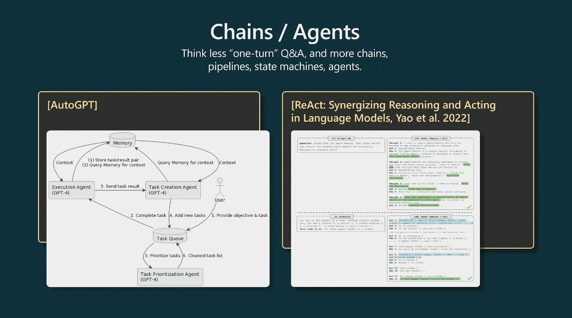 도구와 플러그인을 실험하여 기본적으로 LLM에게 어려운 작업을 오프로드한 다음 단일 프롬프트 및 답변이 아닌 것에 대해 생각하십시오. 잠재적인 변화와 반영, 그것들을 함께 붙이는 방법, 잠재적으로 여러 샘플을 만들 수 있는 방법 등에 대해 생각해 보십시오.