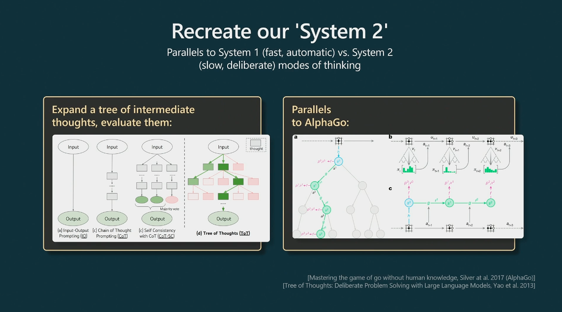 좀 더 일반적으로, 이러한 기술 중 많은 부분이 시스템 2를 재생성한다고 말하는 bucket에 속한다고 생각합니다. 여러분은 인간을 위한 시스템 1, 시스템 2 사고에 익숙할 것입니다. 시스템 1은 빠르고 자동적인 프로세스이며 토큰을 샘플링하는 LLM에 해당한다고 생각합니다. 그리고 시스템 2는 더 느리고 의도적으로 계획하는 뇌의 한 부분입니다.