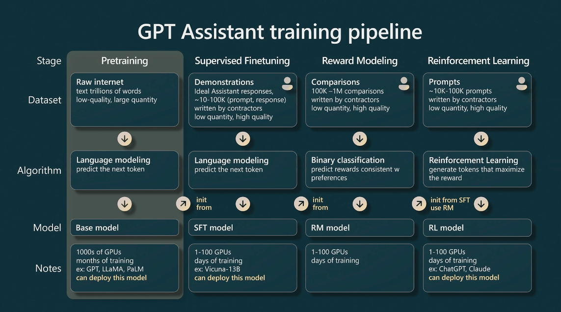 그래서 여기에서 우리는 슈퍼컴퓨터에 있는 수천 개의 GPU와 잠재적으로 수개월의 훈련을 통해 인터넷 규모의 데이터 세트를 다루고 있습니다. 다른 세 단계는 몇 시간 또는 며칠 동안 GPU 몇 개에 훨씬 더 가까운 fine tuning 단계입니다.