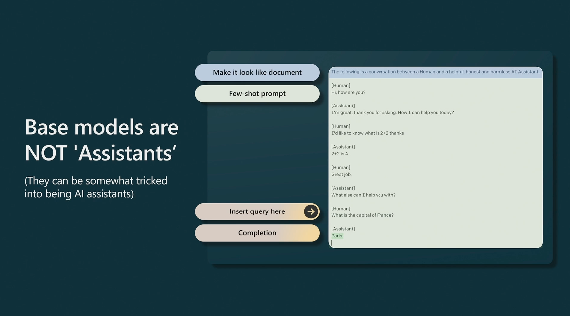 기본 모델을 보조자로 속일 수도 있습니다. 이를 수행하는 방법은 사람과 조수 사이에 일종의 문서가 있고 일종의 정보를 교환하는 것처럼 보이게 하는 특정 몇 번만 프롬프트를 만드는 것입니다.