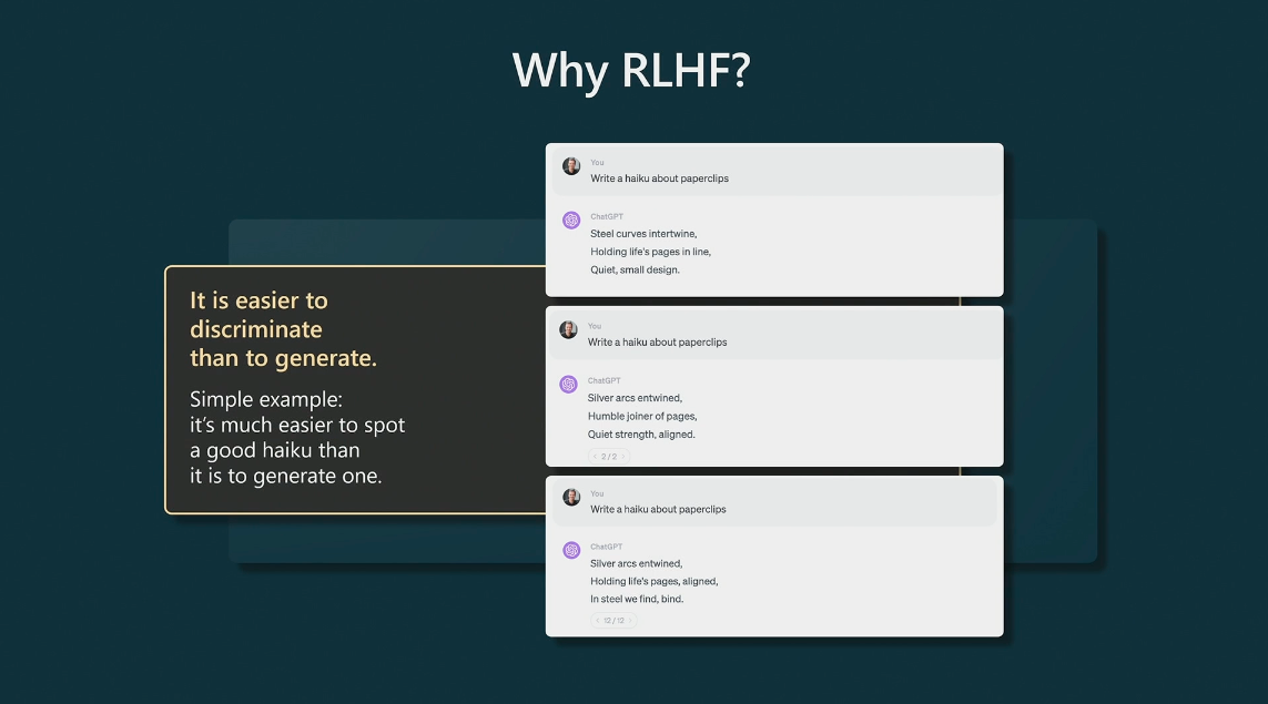 하이쿠(haiku)를 생성하는 예를 들어 보겠습니다. 모델에게 클립에 대한 하이쿠를 쓰라고 요청한다고 가정해 보겠습니다. 훈련 데이터를 제공하려는 계약자라면 SFT에 대한 기본 데이터를 수집하는 계약자라고 상상해 보십시오. 클립으로 멋진 하이쿠를 만들려면 어떻게 해야 합니까? 당신이 그것에 능숙하지 않을 수도 있지만, 내가 당신에게 하이쿠의 몇 가지 예를 든다면, 당신은 이 하이쿠들 중 일부를 다른 하이쿠들보다 훨씬 더 감상할 수 있을 것입니다. 그래서 어느 것이 좋은지 판단하는 것이 훨씬 쉬운 일입니다. 따라서 기본적으로 이 비대칭성은 비교가 인간으로서 잠재적으로 자신을 활용하고 약간 더 나은 모델을 만들기 위한 판단에 더 나은 방법이 되도록 만듭니다.