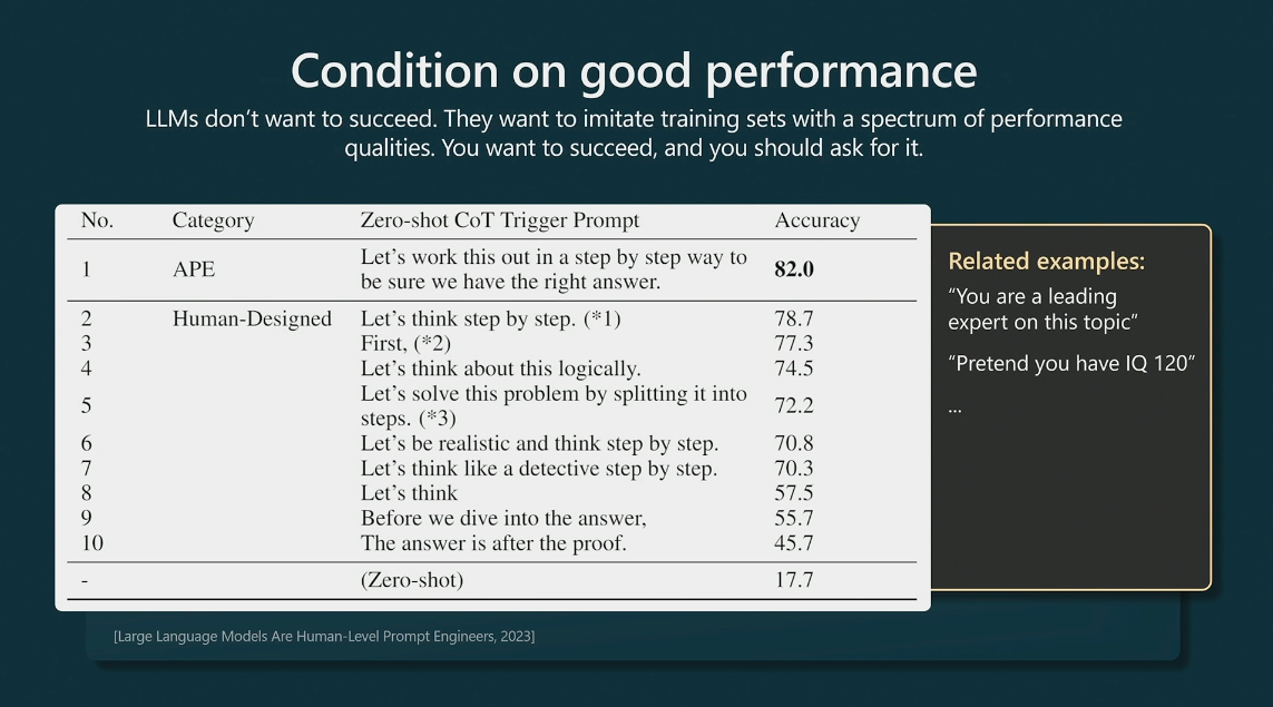 이 예에서, 이 논문에서 그들은 다양한 프롬프트를 시도했고, 많은 토큰에 대한 추론을 펼치는 것과 같기 때문에 단계별로 매우 강력하다고 생각합시다. 그러나 더 나은 방법은 올바른 답을 얻을 수 있도록 단계별로 해결해 보자는 것입니다. 그래서 그것은 정답을 얻기 위한 일종의 조건화와 같습니다. 그리고 이것은 실제로 트랜스포머가 더 잘 작동하도록 합니다. 왜냐하면 트랜스포머는 말도 안 되는 것처럼 저품질 솔루션에 확률 질량을 헤지할 필요가 없기 때문입니다.
