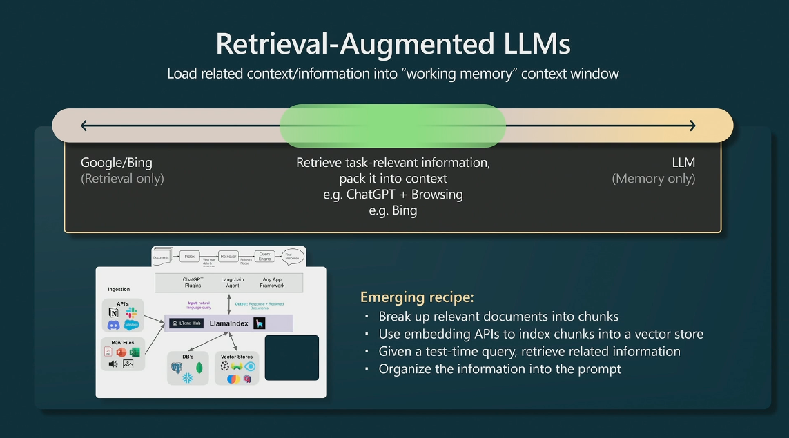 새로운 레시피는 관련 문서를 가져오고, 청크로 분할하고, 모두 삽입하고, 기본적으로 해당 데이터를 나타내는 삽입 벡터(embedding vectors)를 얻는 것입니다. 이를 벡터 저장소(vector store)에 저장한 다음 테스트 시간에 벡터 저장소에 일종의 쿼리를 만듭니다. 작업과 관련이 있을 수 있는 청크를 가져와 프롬프트에 입력한 다음 생성합니다. 이것은 실제로 잘 작동할 수 있습니다.