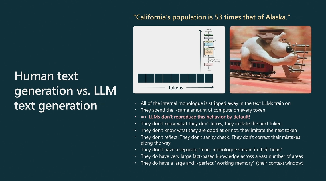 그것이 내가 그 두 가지를 비교하는 방법입니다. 제가 이 모든 것을 언급하는 이유는 제 생각에 자극은 여기 있는 우리의 두뇌와 LLM 두뇌와 같은 두 종류의 아키텍처 사이의 인지적 차이를 보완하는 것이라고 생각하기 때문입니다. 거의 그렇게 보시면 됩니다.