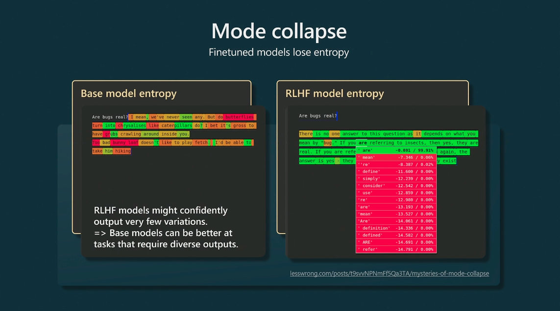 이제 RLHF 모델은 경우에 따라 기본 모델을 엄격하게 개선한 것이 아닙니다. 특히, 예를 들어 엔트로피가 약간 손실되는 것을 발견했습니다. 그것은 그들이 더 많은 (PT?) 결과를 제공한다는 것을 의미합니다. 더 낮은 변형을 출력할 수 있습니다. 기본 모델보다 변동이 적은 샘플을 출력할 수 있습니다. 기본 모델에는 많은 엔트로피가 있으며 다양한 출력을 제공합니다.