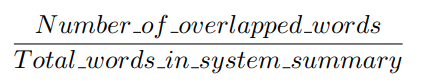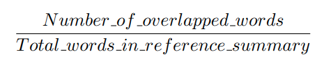 Recall은 참조 요약본을 구성하는 단어 중 몇 개의 단어가 시스템 요약본의 단어들과 겹치는지를 보는 점수입니다.