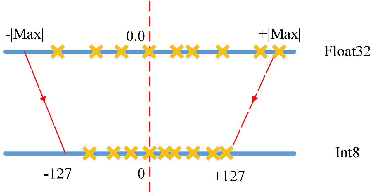 예를 들어, 기존 계층의 소수값 범위가 -3.0 부터 6.0 까지라면, -3.0 은 -127 로, 6.0 은 +127 로 매핑됩니다.