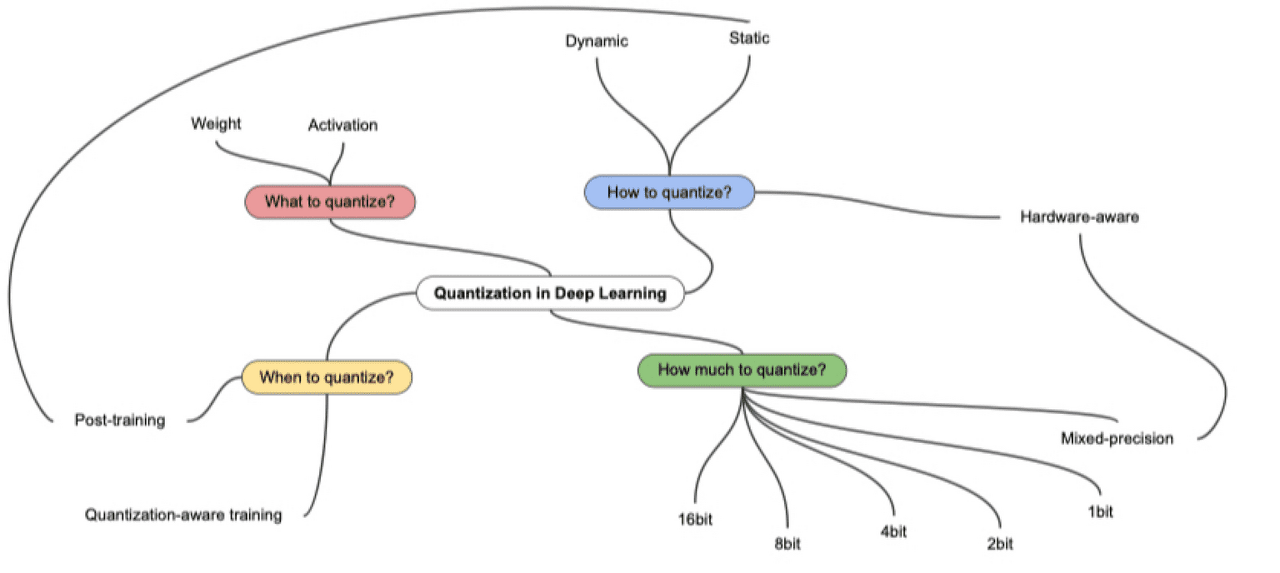 | Dynamic Quantization | 미리 학습된 모델의 가중치와 활성화 함수의 비트 수를 줄이는 기법 런타임 시 양자화되며, 가중치와 활성화 함수의 분포에 따라 크기가 다양하게 조절 인퍼런스 중 성능 저하가 덜 발생하며, 변환 비용이 낮음 |