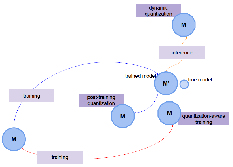 | Quantization Aware Training(QAT) | 훈련 중에 양자화를 고려하여 모델을 조정하는 방법 가중치 양자화에 대한 학습을 포함하여 원본 모델을 보다 양자화에 robust하게 만듦 일반적으로 인퍼런스 시 성능 저하가 적음 |