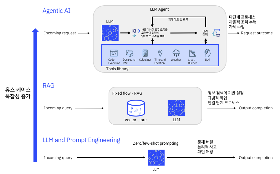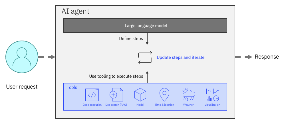 AI 에이전트는 LLM을 사용하여 추론하고, 도구, 다른 모델 및 기타 IT 시스템과 연동하여 사용자 목표를 달성할 수 있습니다.
