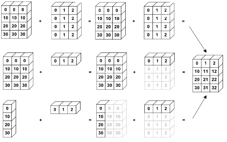 - 연산을 수행하는 축을 제외한 나머지 축의 shape이 일치하거나 둘 중 하나의 길이가 1이여야 함