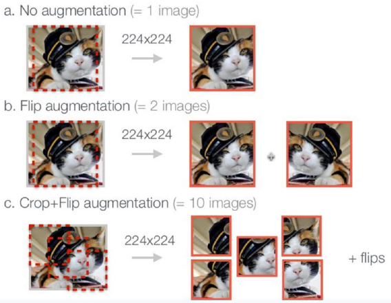 - 테스트할 이미지 한장에서 이미지 4귀퉁이 + 가운데서 224x224 크기로 crop한 5장을 flip하여 10장 이미지 만듦