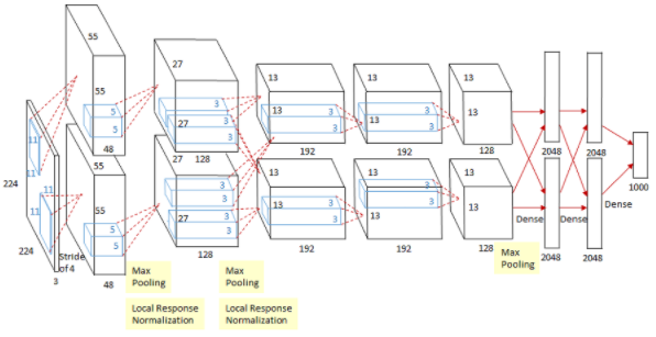 - 2012년 개최된 ILSVRC(ImageNet Large Scale Visual Recognition Challenge) 대회의 우승을 차지한 CNN 구조