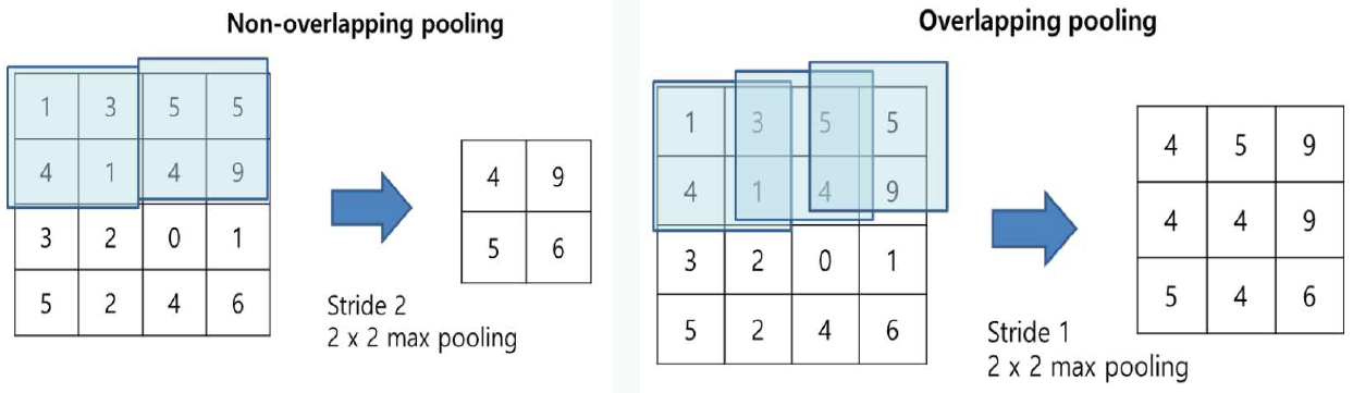 - Overlapping Pooling: stirde를 커널 사이즈보다 작게
