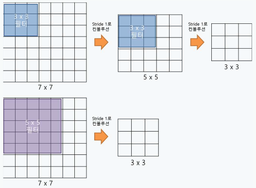 - 큰 필터로 구성된 하나의 레이어를 작은 필터의 여러 레이어로 나누었기 때문에 Relu non-linerlity가 들어갓 곳이 더 많아짐